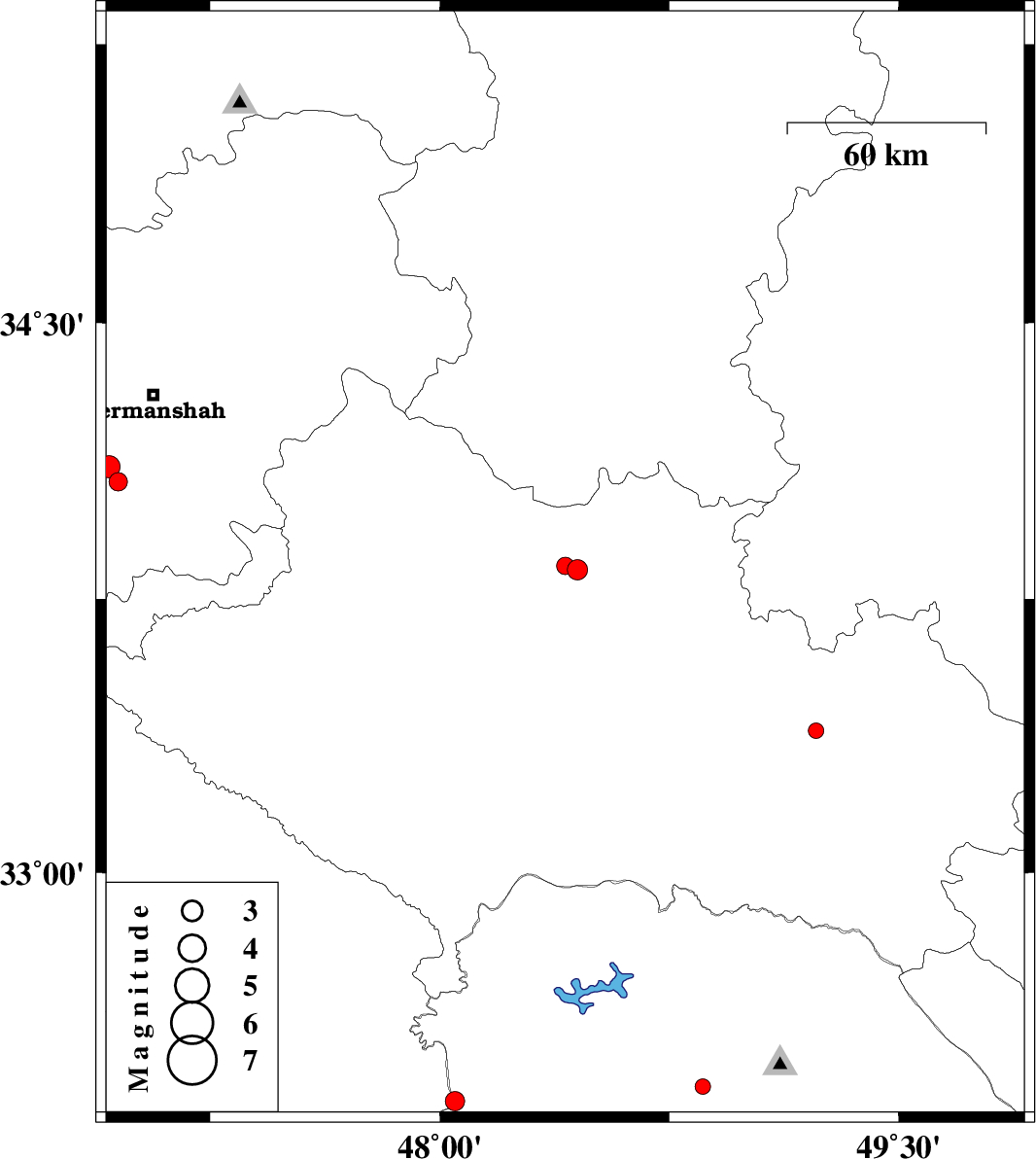 | 2012/11/20 | 10:05:05.7 | 13:35:05.7 | 34.11 | 46.92 | 15 | ML3.2 | Kermanshah Province, 30 km East of Eslam Abad-E-Gharb | ||