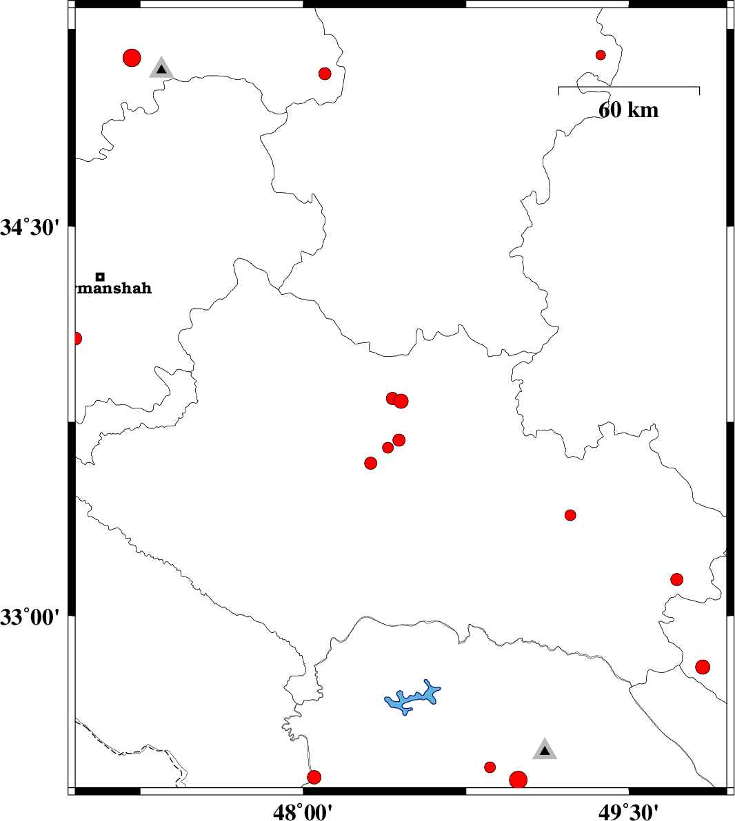 | 2012/11/23 | 01:01:23.6 | 04:31:23.6 | 33.83 | 48.45 | 17 | ML3 | Lorestan Province, 14 km East of Aleshtar | ||