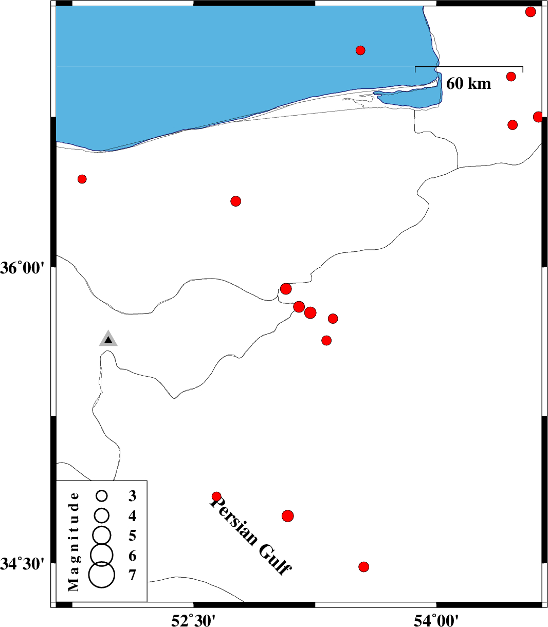 | 2012/11/01 | 19:31:01.7 | 23:01:01.7 | 35.89 | 53.07 | 15 | ML3.1 | Semnan Province, 25 km South of Pol-E-Sefid |