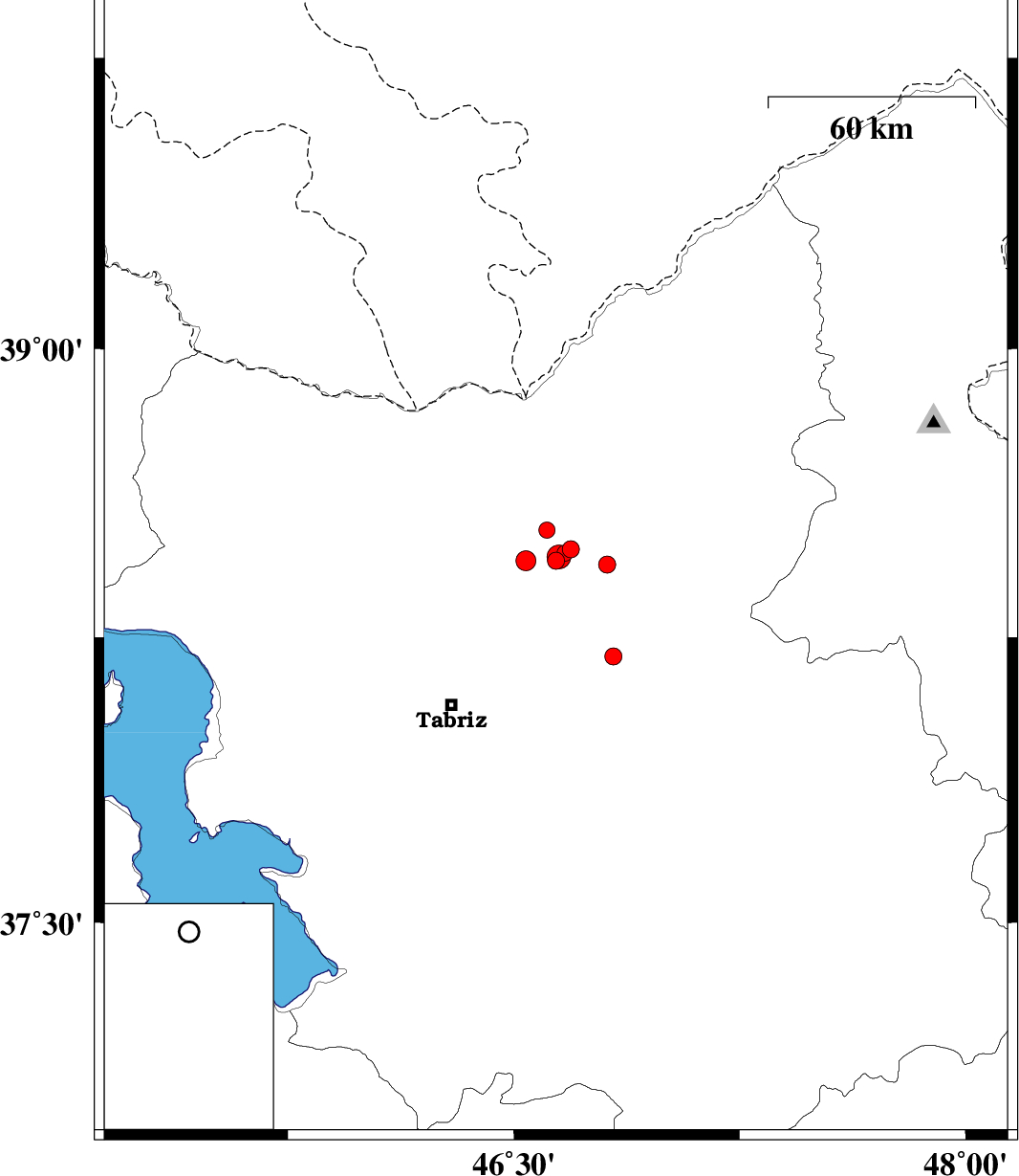 | 2012/11/26 | 01:40:08.6 | 05:10:08.6 | 38.46 | 46.65 | 16 | ML3.5 | Azarbaijan Sharghi Province, 38 km West of Ahar |