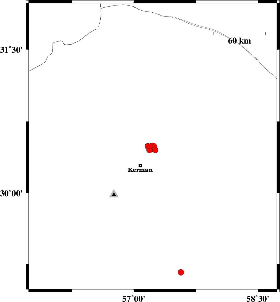 | 2012/12/03 | 13:44:27.8 | 17:14:27.8 | 30.45 | 57.19 | 14 | ML3.3 | Kerman Province, 21 km North-East of Kerman | ||