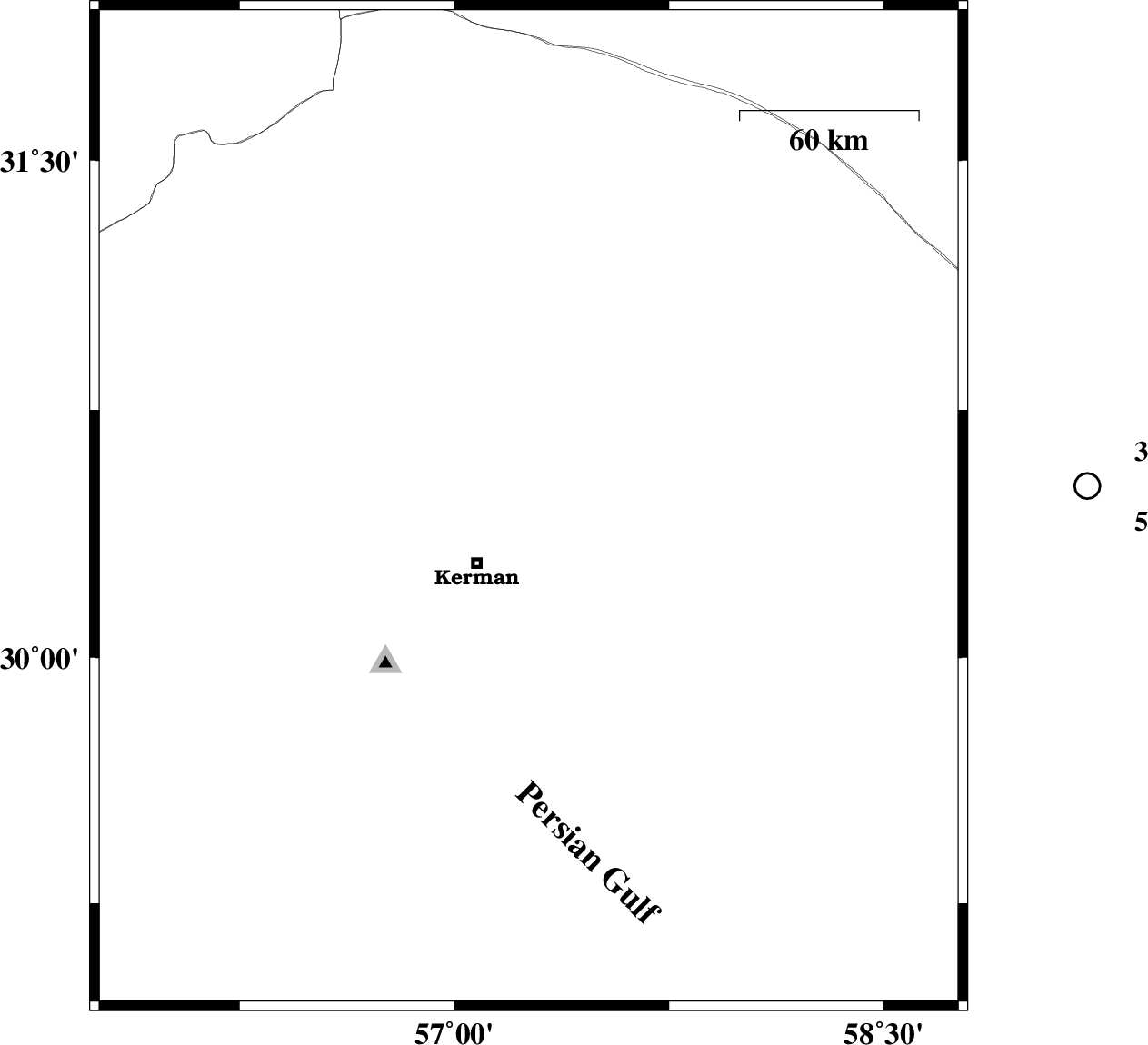 | 2012/12/03 | 13:44:27.8 | 17:14:27.8 | 30.45 | 57.19 | 14 | ML3.3 | Kerman Province, 21 km North-East of Kerman | ||
