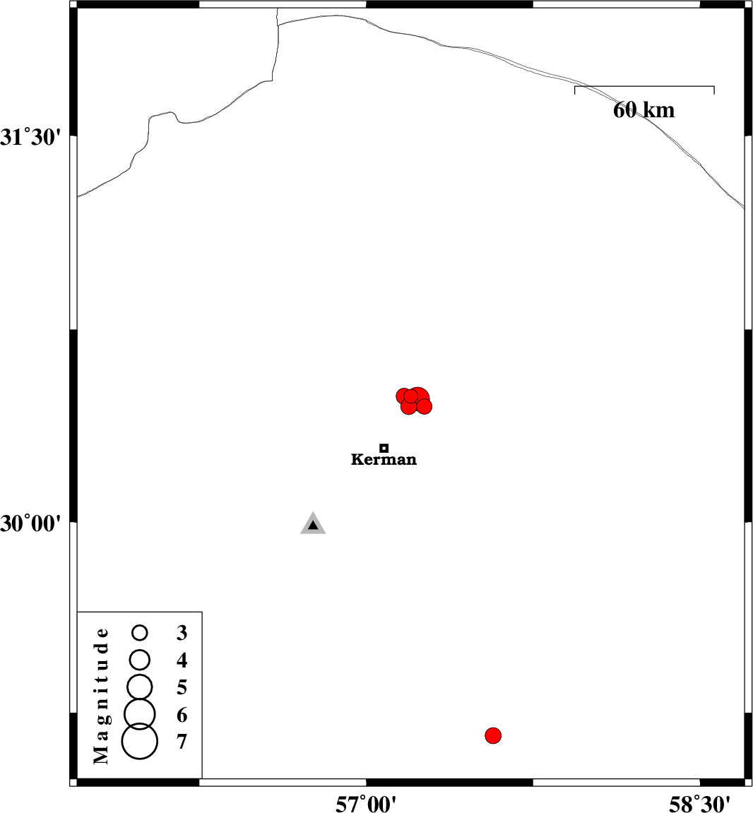 | 2012/12/03 | 13:44:27.8 | 17:14:27.8 | 30.45 | 57.19 | 14 | ML3.3 | Kerman Province, 21 km North-East of Kerman | ||