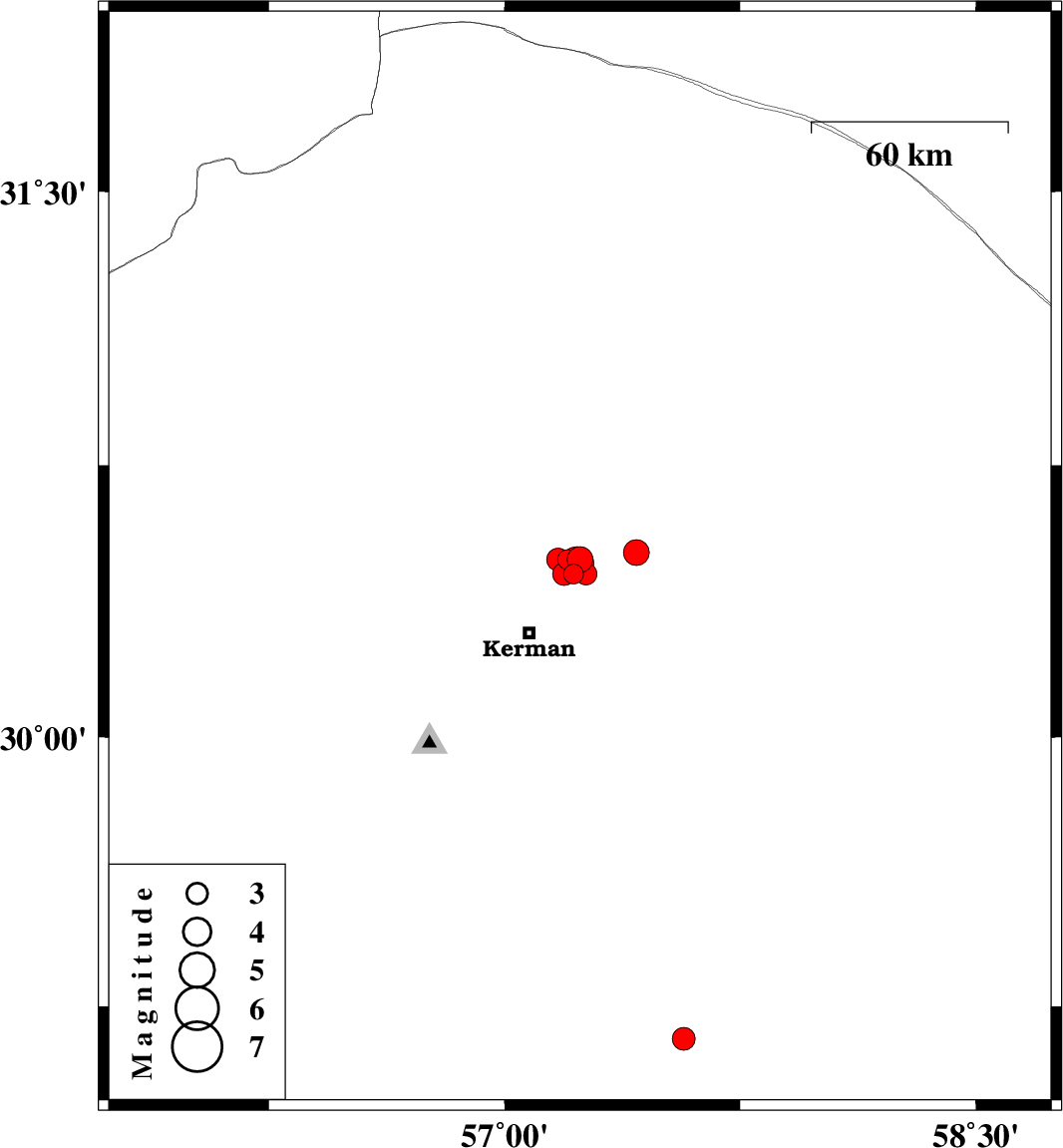 | 2012/11/14 | 00:46:13.4 | 04:16:13.4 | 30.51 | 57.42 | 16 | ML3.6 | Kerman Province, 40 km North-East of Kerman |
