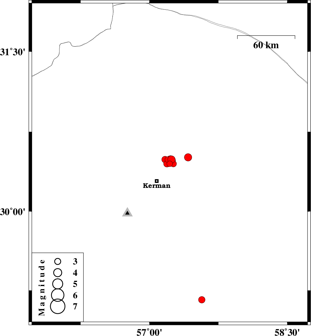 | 2012/11/14 | 00:46:13.4 | 04:16:13.4 | 30.51 | 57.42 | 16 | ML3.6 | Kerman Province, 40 km North-East of Kerman |