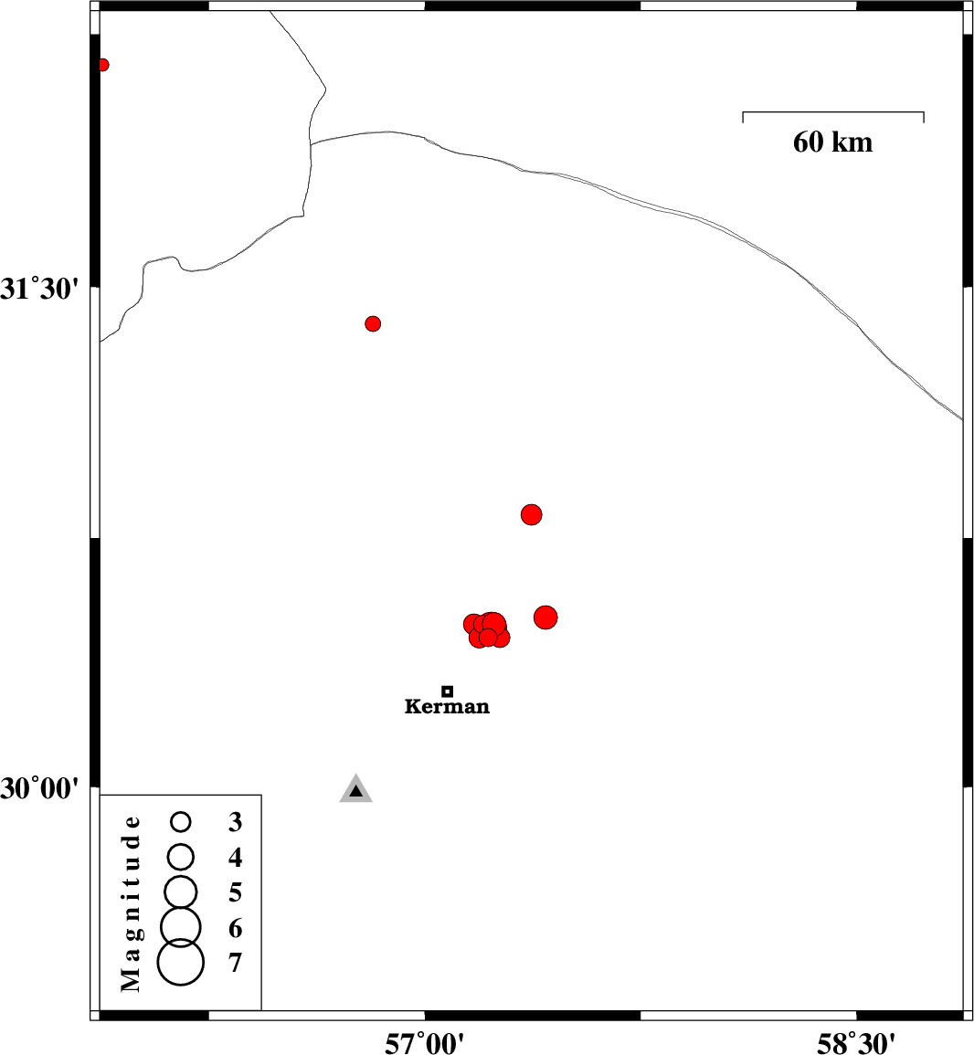 | 2012/11/14 | 00:46:13.4 | 04:16:13.4 | 30.51 | 57.42 | 16 | ML3.6 | Kerman Province, 40 km North-East of Kerman |