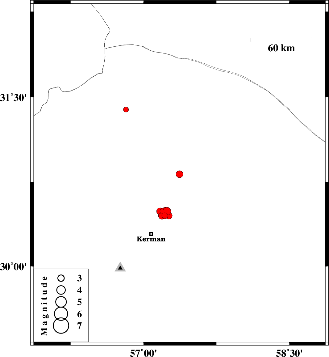 | 2012/12/05 | 07:43:12.9 | 11:13:12.9 | 31.39 | 56.82 | 14 | ML2.4 | Kerman Province, 14 km North of Ravar | ||