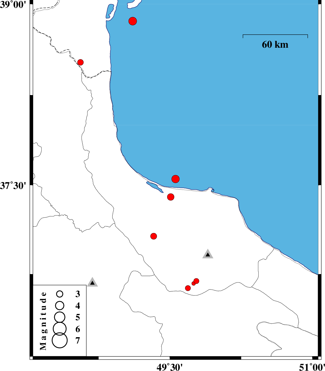 | 2012/12/08 | 21:31:50.5 | 01:01:50.5 | 37.55 | 49.56 | 18 | ML3.6 | Caspian Sea, 12 km Bandar-e anzali | ||