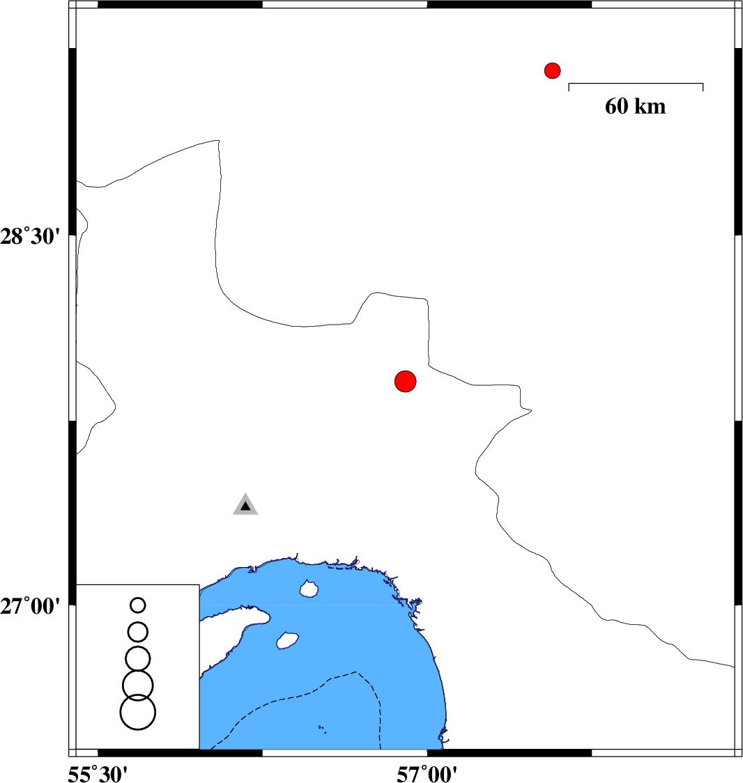 | 2012/12/09 | 00:14:06.4 | 03:44:06.4 | 27.91 | 56.9 | 14 | ML4.4 | Hormozgan Province, 63 km North-West of Dehbarez | ||