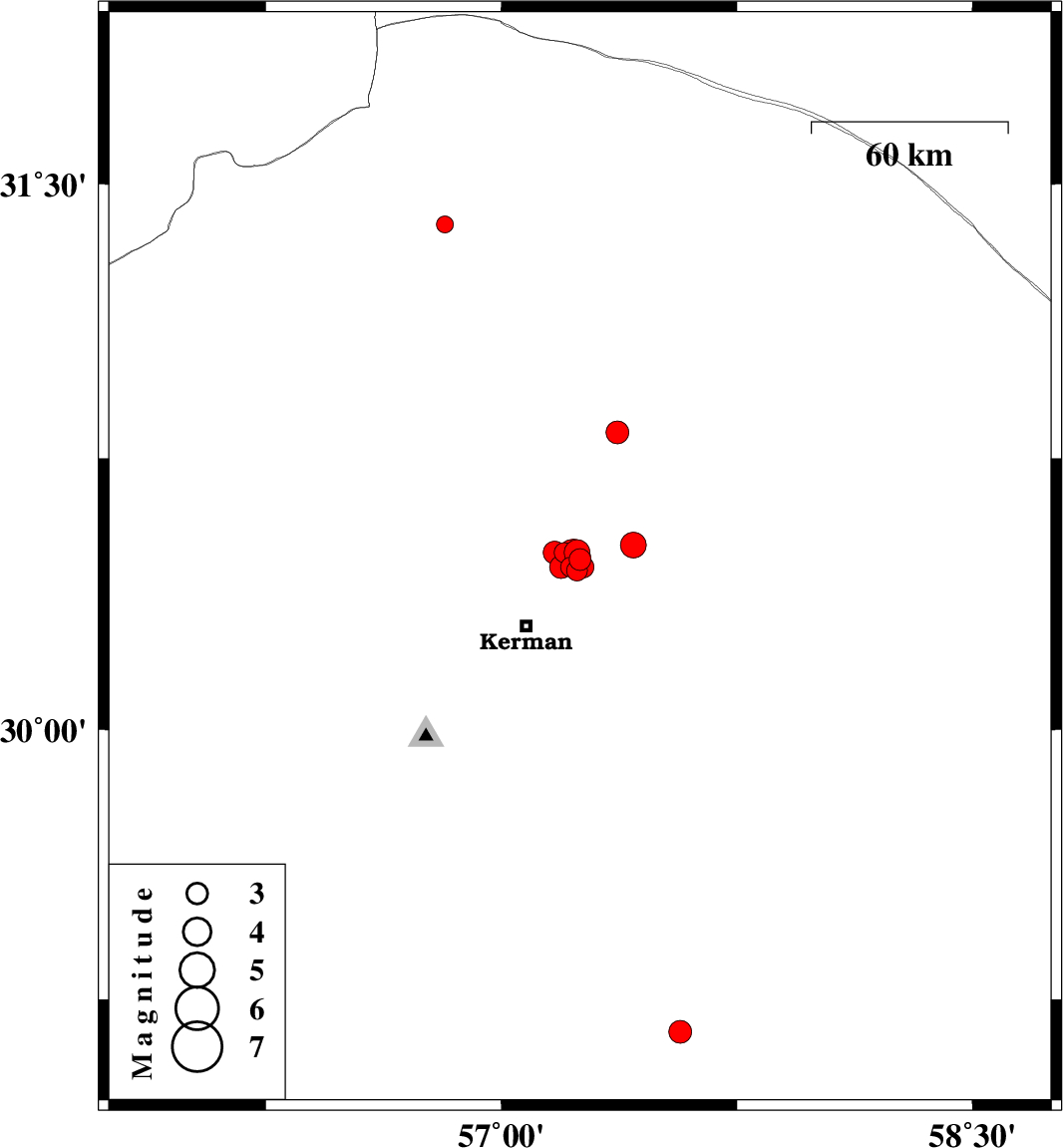 | 2012/11/14 | 00:46:13.4 | 04:16:13.4 | 30.51 | 57.42 | 16 | ML3.6 | Kerman Province, 40 km North-East of Kerman |