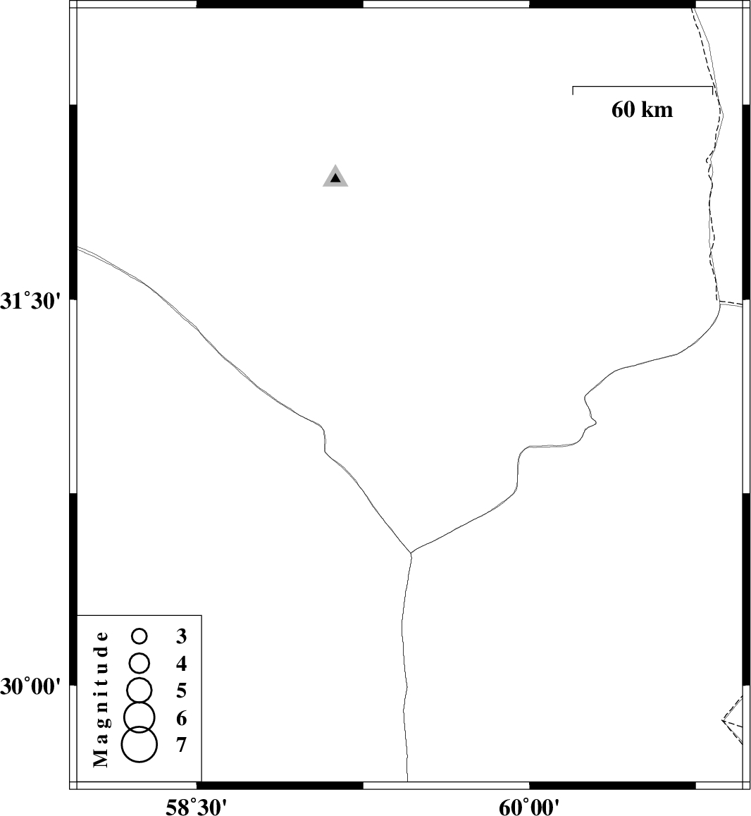 | 2012/12/13 | 21:21:41.8 | 00:51:41.8 | 31.12 | 59.46 | 42 | ML3.3 | Khorasan(south) Province, 72 km South-West of Nehbandan |
