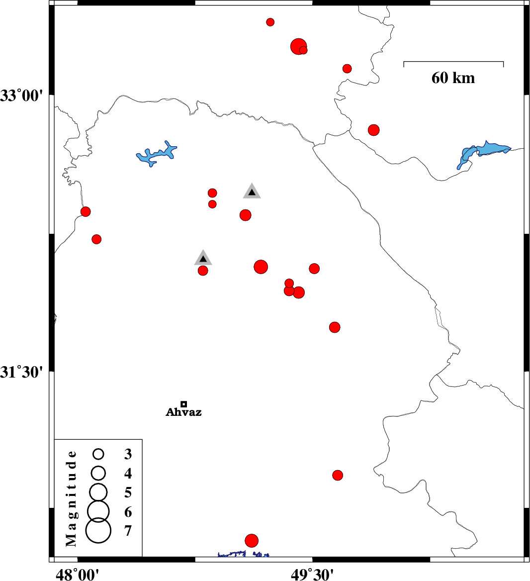| 2012/12/05 | 22:32:15.3 | 02:02:15.3 | 32.47 | 48.86 | 14 | ML2.5 | Khoozestan Province, 25 km West of Lali | ||