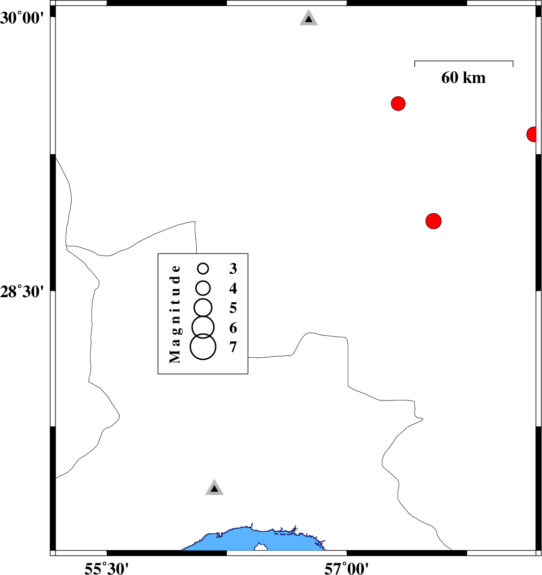 | 2012/12/09 | 00:14:06.4 | 03:44:06.4 | 27.91 | 56.9 | 14 | ML4.4 | Hormozgan Province, 63 km North-West of Dehbarez | ||