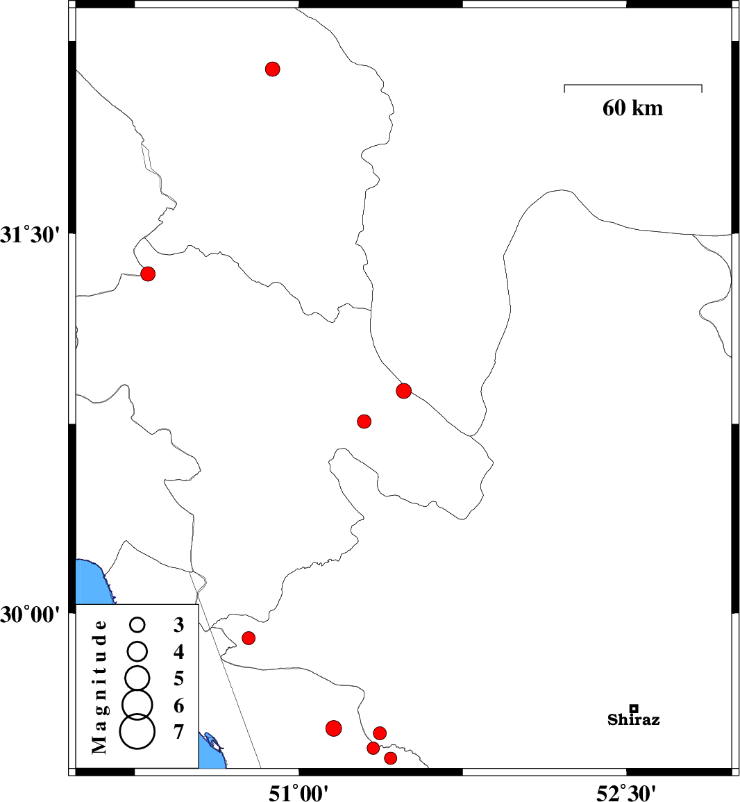 | 2012/11/25 | 05:48:27.7 | 09:18:27.7 | 29.54 | 51.16 | 14 | ML3.2 | Bushehr Province, 31 km North of Borazjan | ||