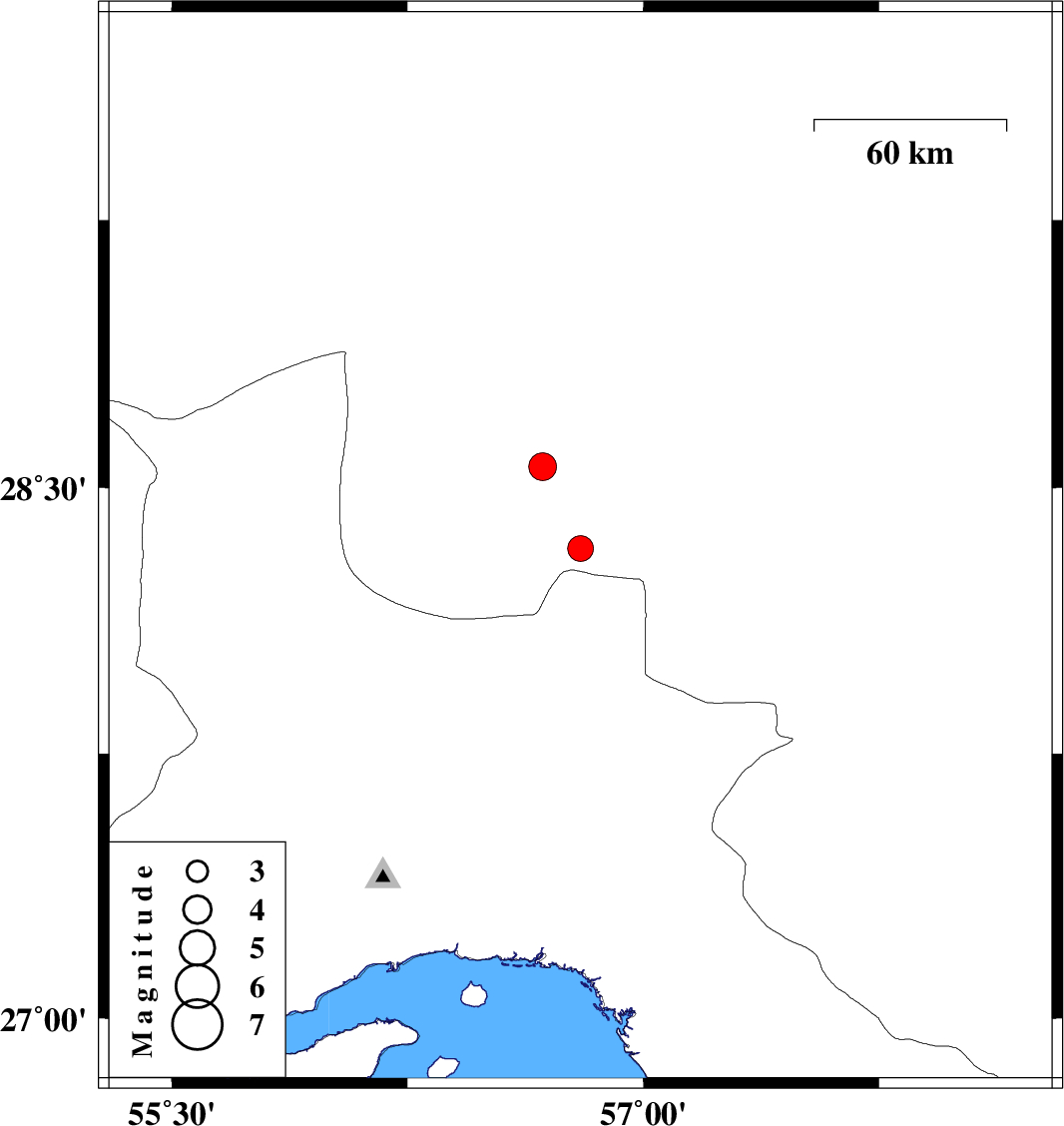 | 2012/12/22 | 20:23:31.7 | 23:53:31.7 | 28.33 | 56.8 | 18 | ML3.6 | Kerman Province, 88 km East of Hajiabad | ||