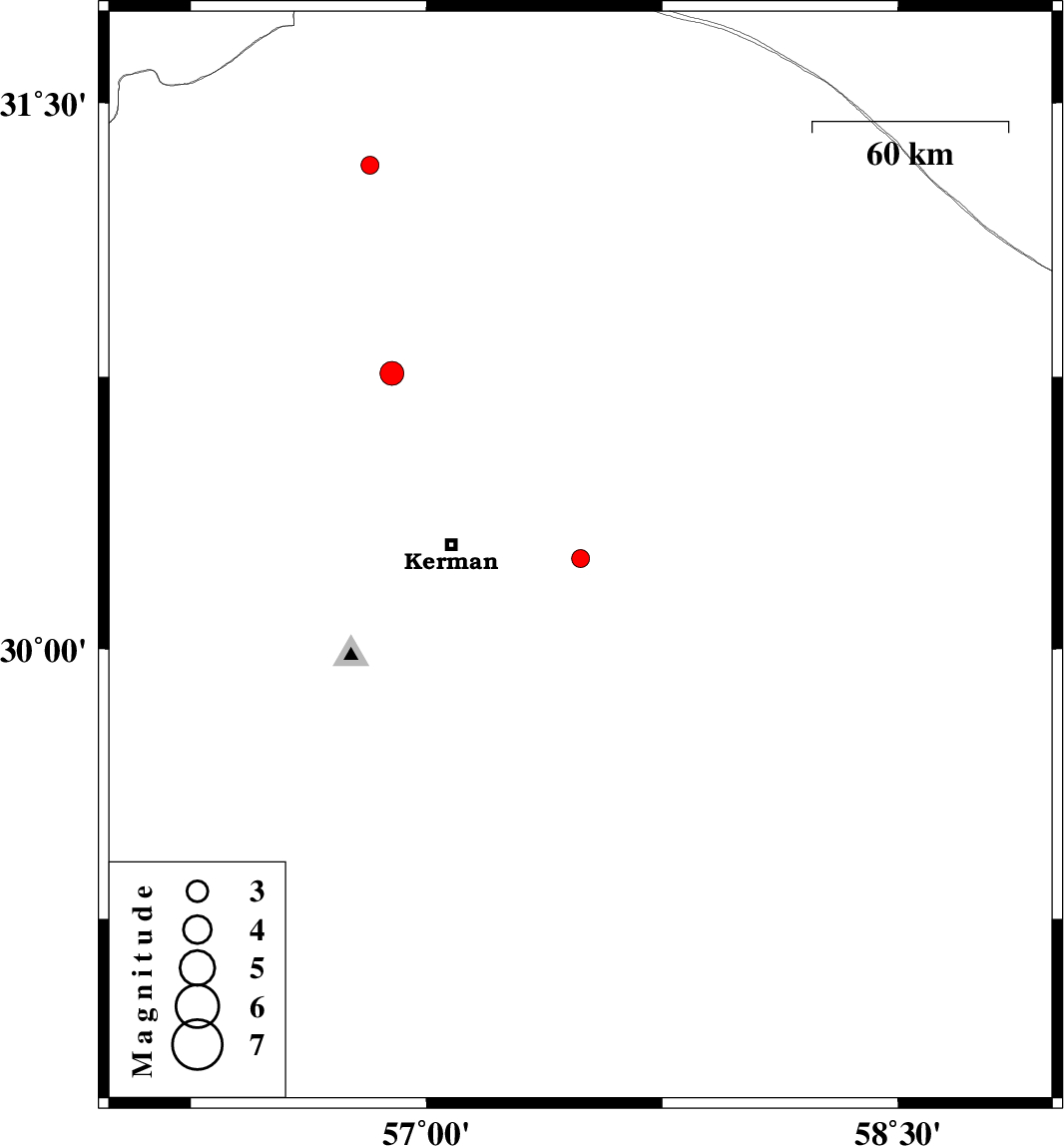 | 2012/12/19 | 02:06:01.9 | 05:36:01.9 | 31.33 | 56.82 | 14 | ML2.6 | Kerman Province, 7 km Ravar |