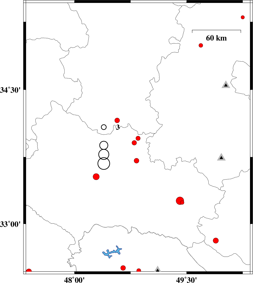 | 2012/12/12 | 02:13:30.5 | 05:43:30.5 | 32.46 | 47.39 | 36 | ML3.2 | 28 km South-East of Dehloran | ||