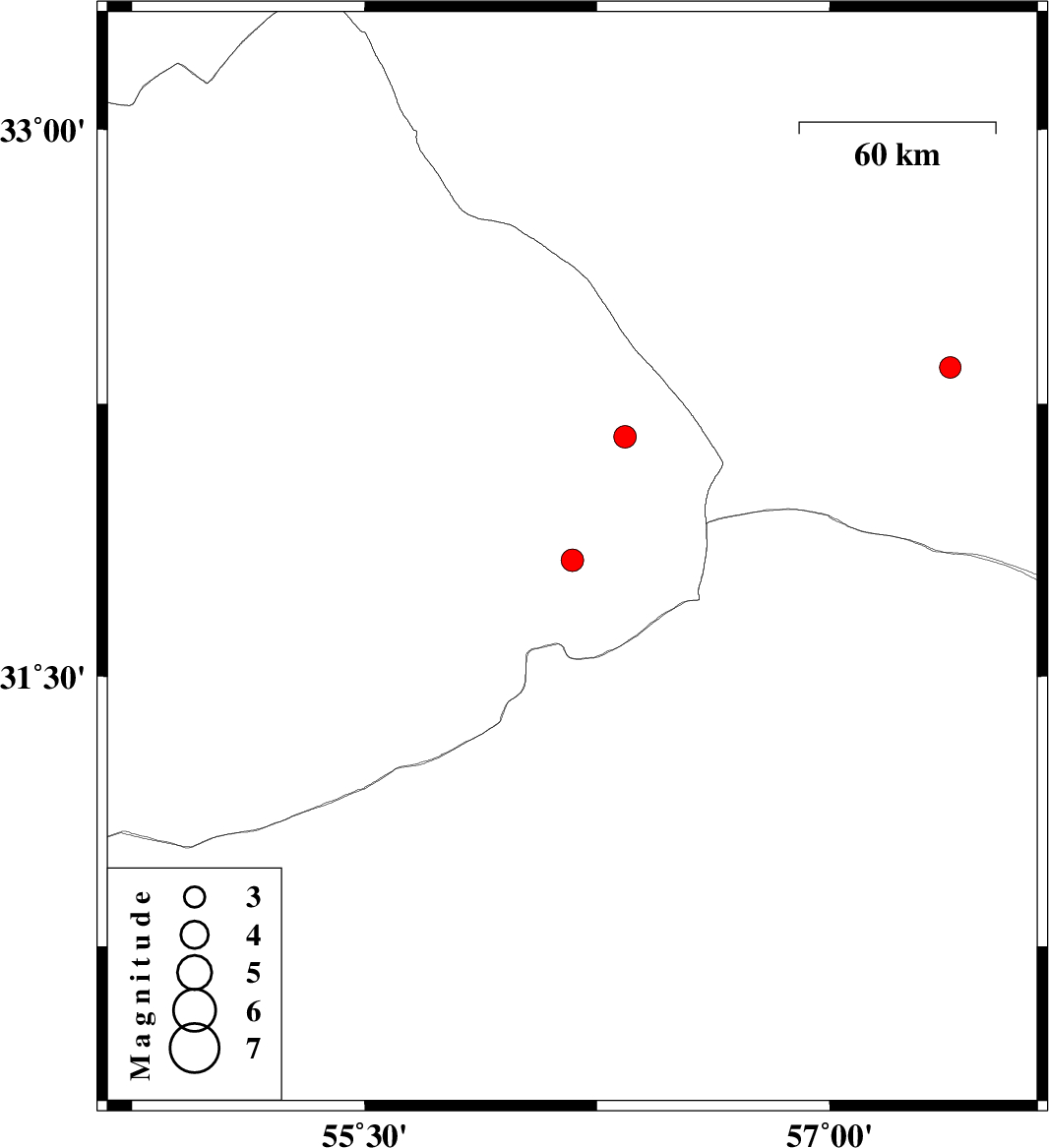 | 2012/12/28 | 19:45:36.4 | 23:15:36.4 | 32.16 | 56.34 | 18 | ML3.2 | Yazd Province, 109 km North-West of Ravar |