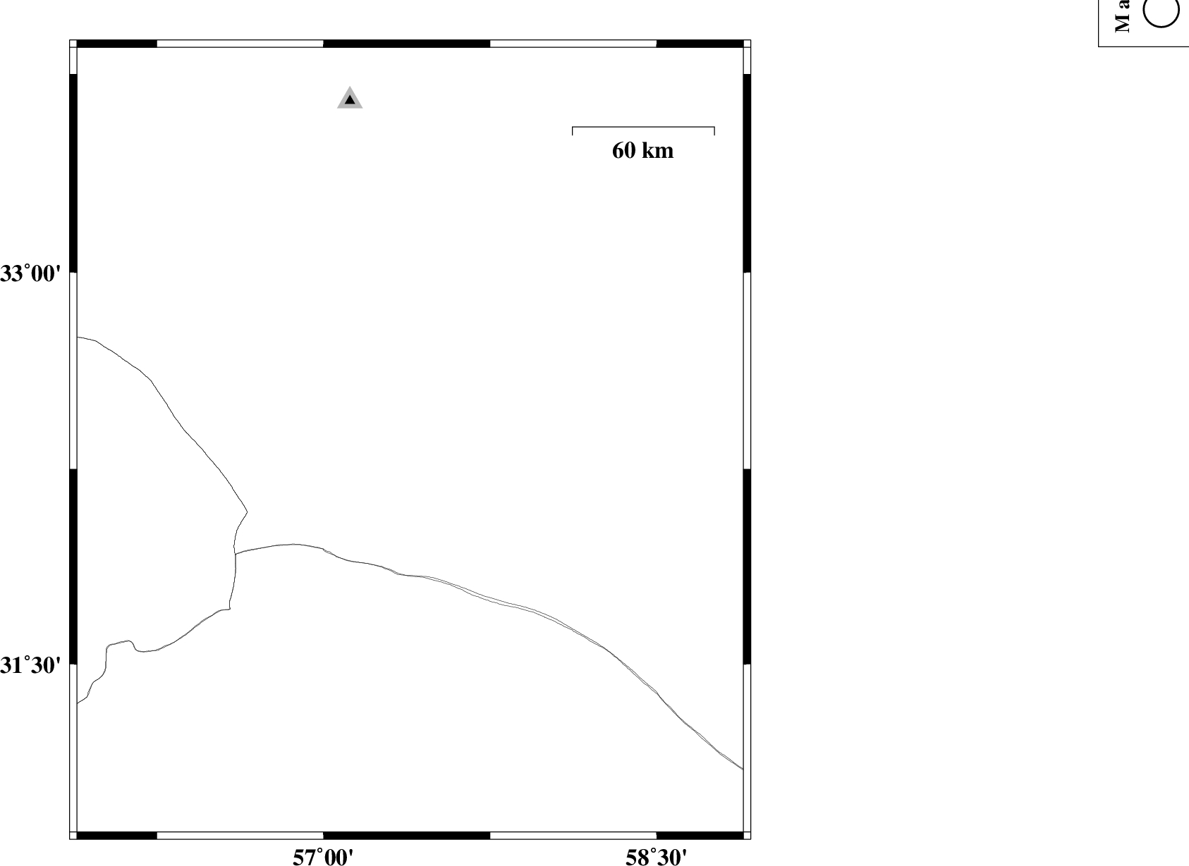 | 2012/12/05 | 07:43:12.9 | 11:13:12.9 | 31.39 | 56.82 | 14 | ML2.4 | Kerman Province, 14 km North of Ravar |