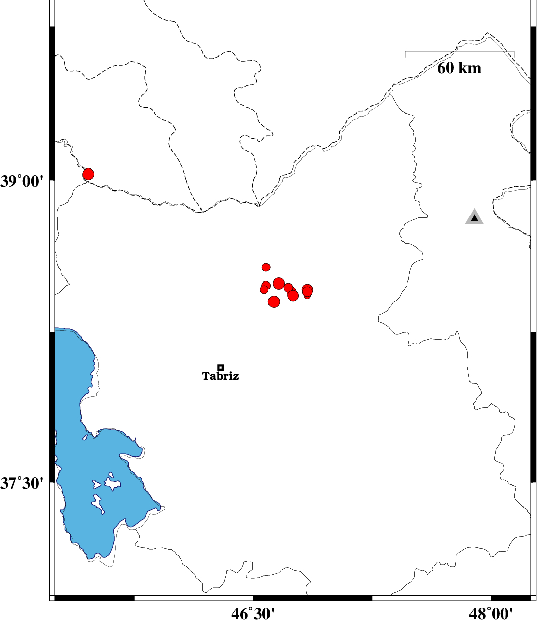 | 2012/12/09 | 08:26:21.2 | 11:56:21.2 | 38.4 | 46.63 | 14 | ML3.3 | Azarbaijan Sharghi Province, 40 km West of Ahar |