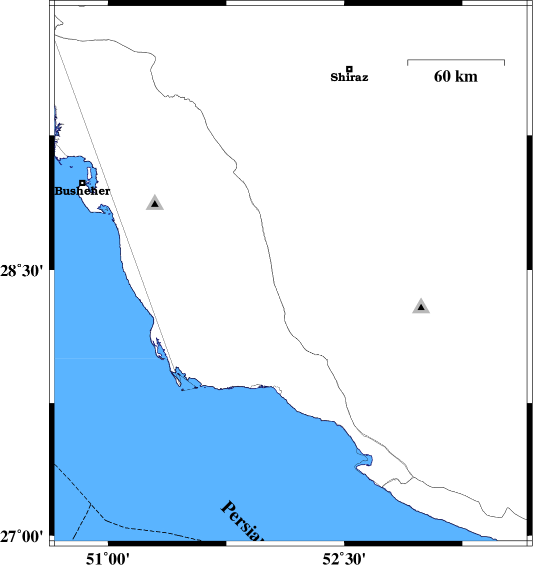 | 2013/01/06 | 13:54:09.8 | 17:24:09.8 | 29.56 | 51.48 | 17 | ML3.4 | Fars Province, 18 km West of Kazerun | ||