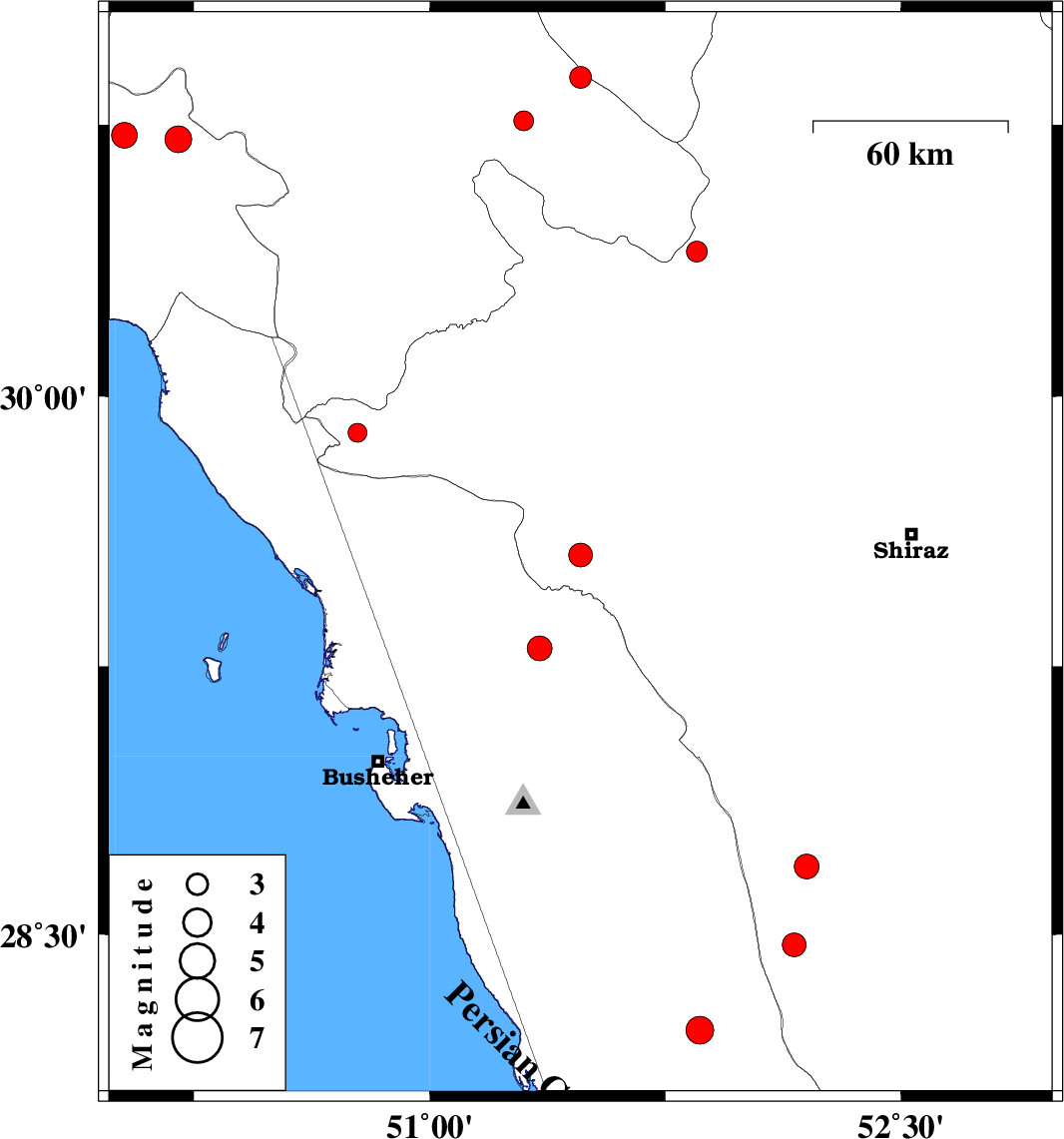 | 2013/01/01 | 08:35:41.1 | 12:05:41.1 | 29.3 | 51.35 | 9 | ML3.5 | Bushehr Province, 15 km East of Borazjan | ||