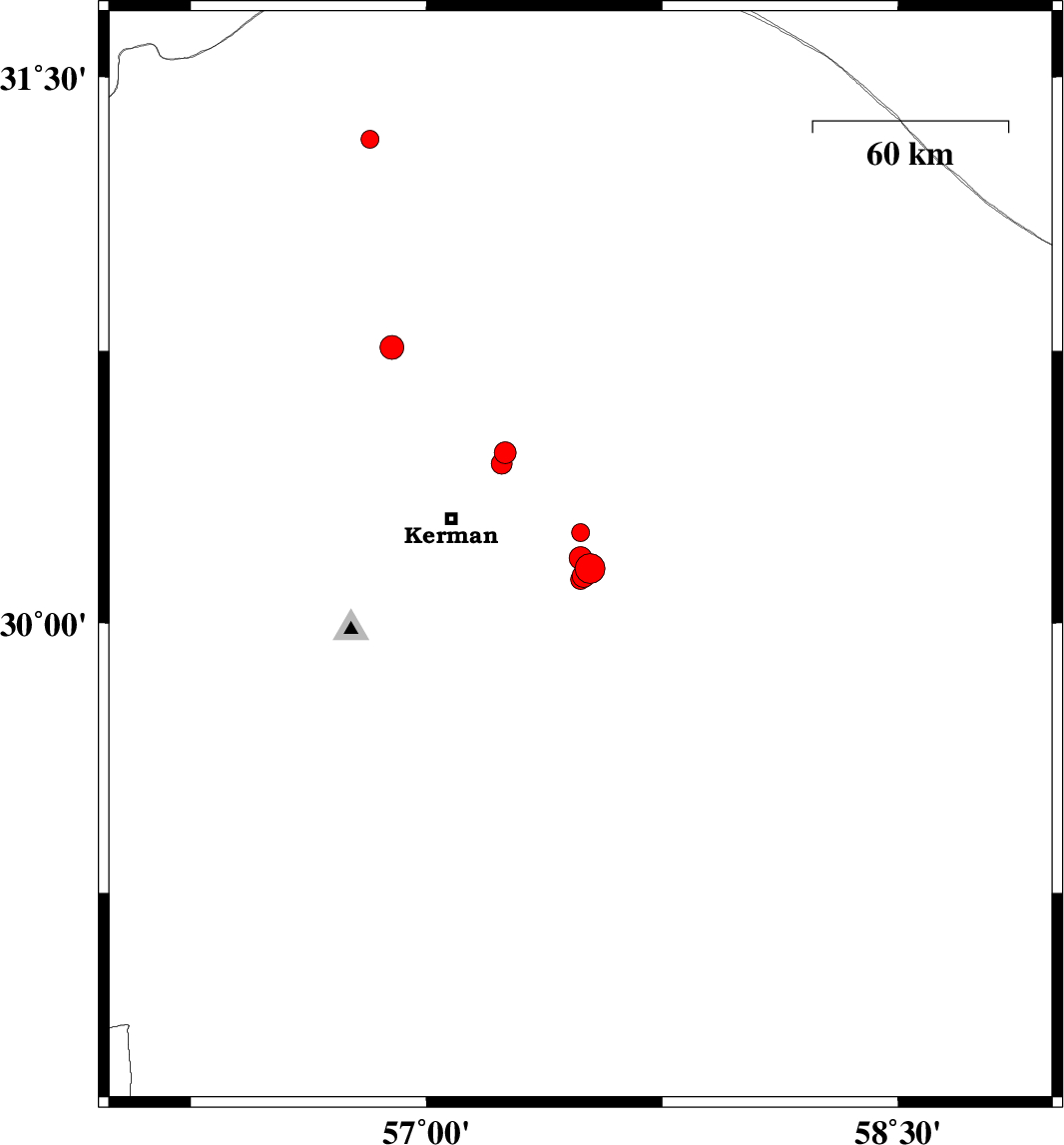 | 2012/12/19 | 11:44:17.7 | 15:14:17.7 | 30.76 | 56.89 | 18 | ML3.4 | Kerman Province, 31 km East of Zarand | ||
