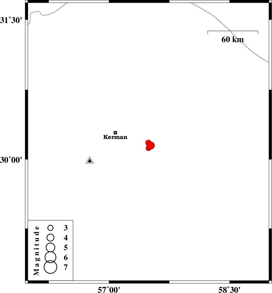 | 2012/12/31 | 19:13:10.3 | 22:43:10.3 | 30.12 | 57.49 | 14 | ML2.8 | Kerman Province, 44 km South-East of Kerman |