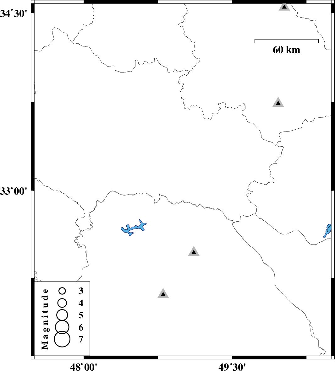 | 2013/01/07 | 13:18:19.8 | 16:48:19.8 | 33.08 | 49 | 14 | ML3.6 | Lorestan Province, 45 km South of Dorud |