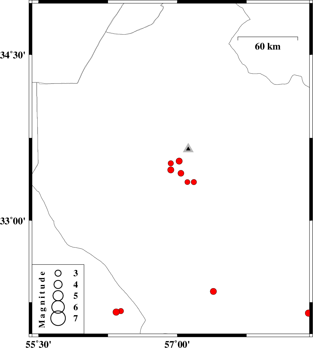 | 2013/01/07 | 12:42:56.1 | 16:12:56.1 | 33.43 | 57.04 | 14 | ML2.9 | Yazd Province, 22 km South-East of Tabas | ||