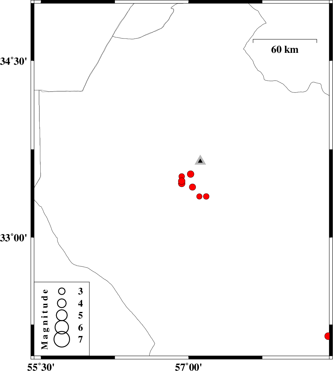 | 2013/01/07 | 12:42:56.1 | 16:12:56.1 | 33.43 | 57.04 | 14 | ML2.9 | Yazd Province, 22 km South-East of Tabas | ||