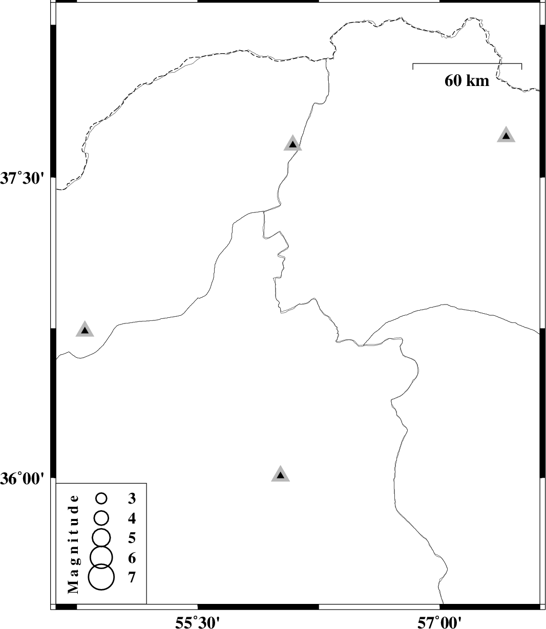 | 2013/01/14 | 06:04:41.7 | 09:34:41.7 | 36.86 | 56.12 | 7 | ML3.8 | Semnan Province, 26 km West of Jajarm |