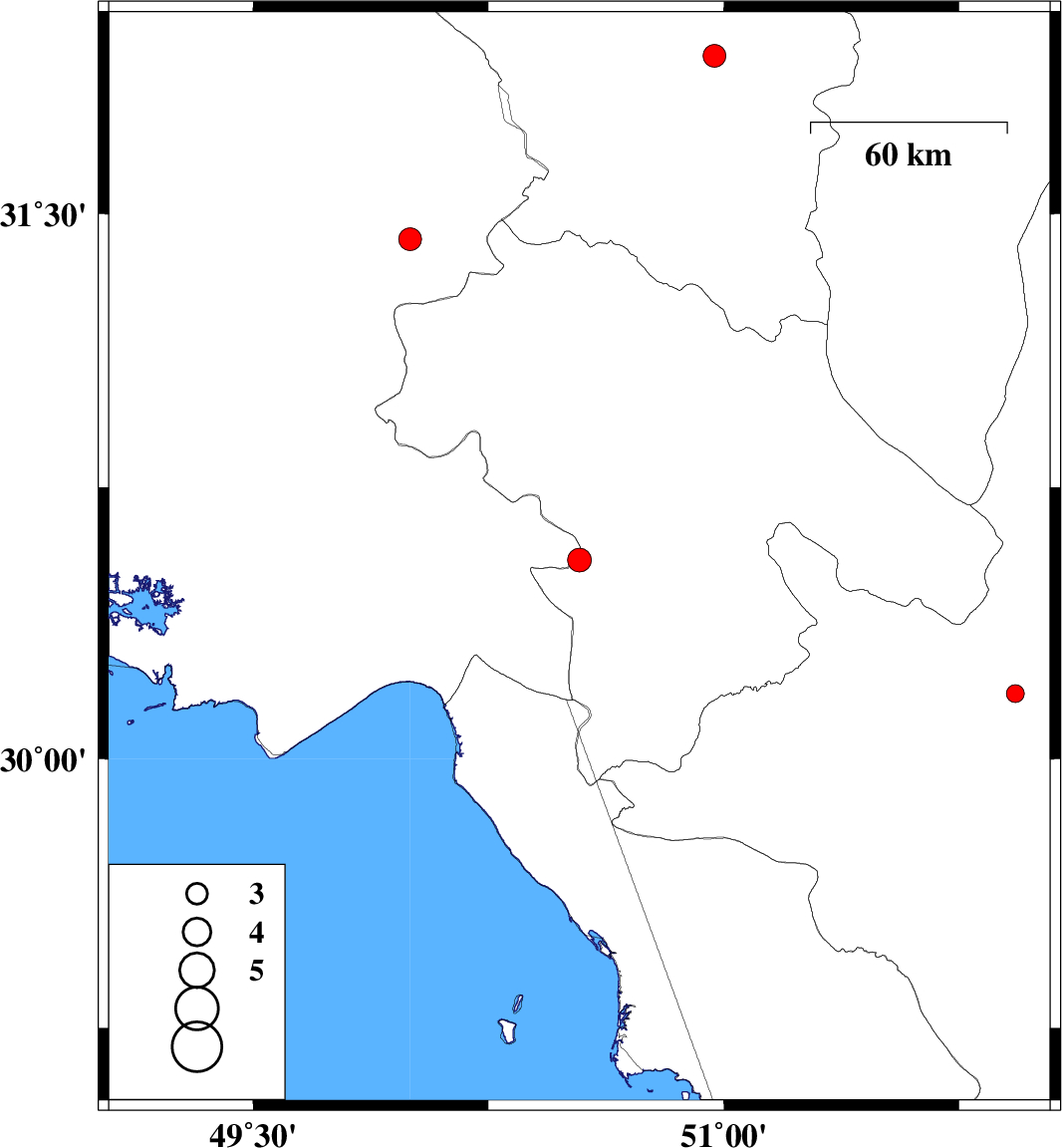 | 2013/01/21 | 18:07:01.1 | 21:37:01.1 | 31.43 | 50 | 15 | ML3.3 | Khoozestan Province, 14 km East of Bagh Malek | ||