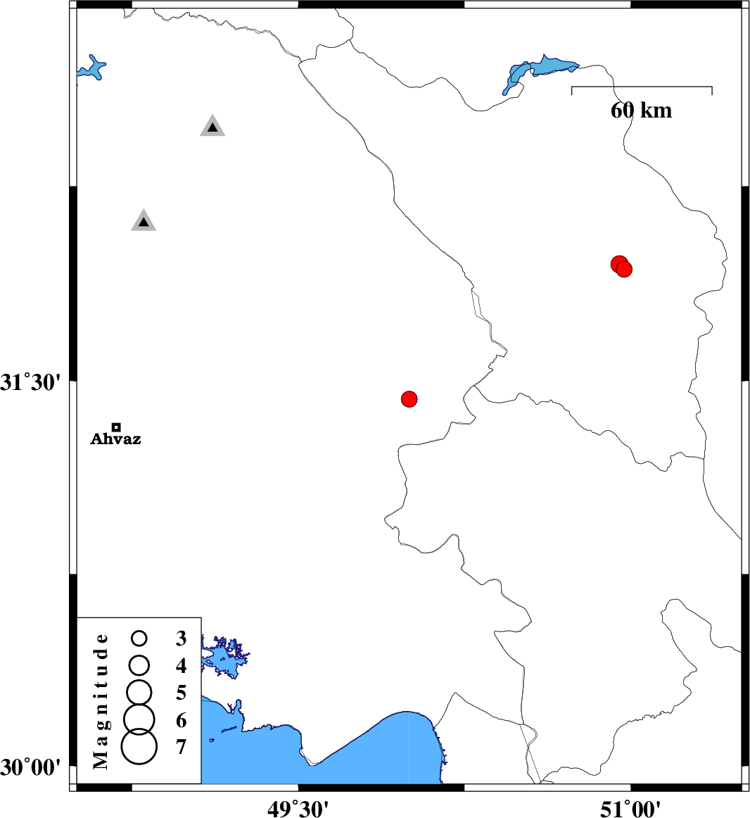 | 2013/01/21 | 18:07:01.1 | 21:37:01.1 | 31.43 | 50 | 15 | ML3.3 | Khoozestan Province, 14 km East of Bagh Malek | ||