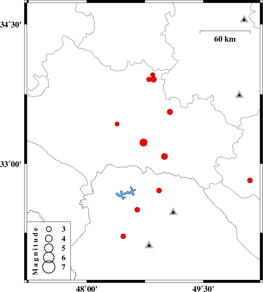 | 2013/01/07 | 13:18:19.8 | 16:48:19.8 | 33.08 | 49 | 14 | ML3.6 | Lorestan Province, 45 km South of Dorud | ||