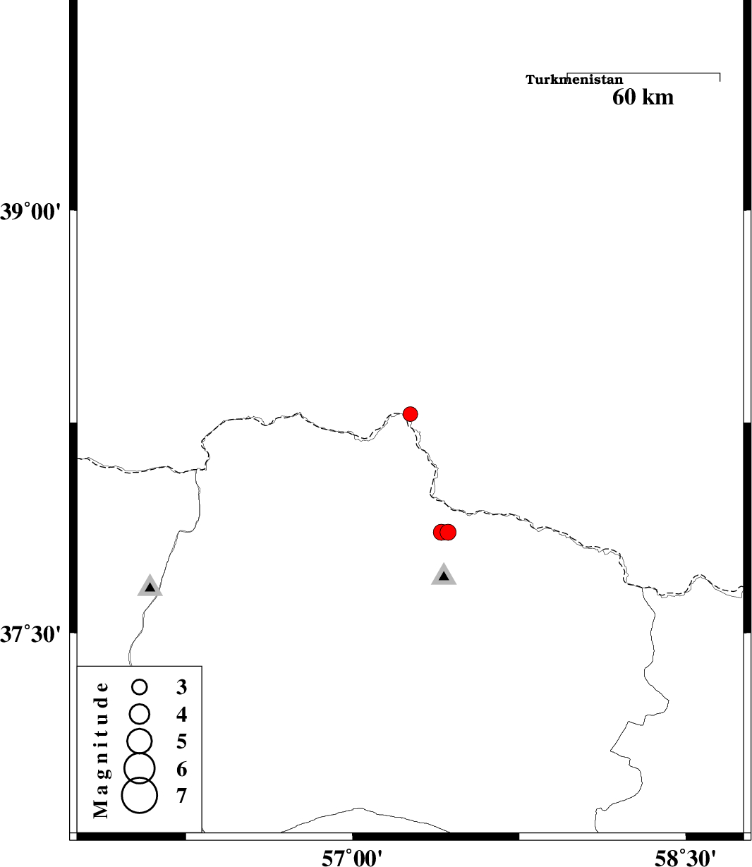 | 2013/01/23 | 17:58:30.4 | 21:28:30.4 | 38.28 | 57.26 | 14 | ML2.9 | Turkmenistan, 90 km North of Bojnurd | ||