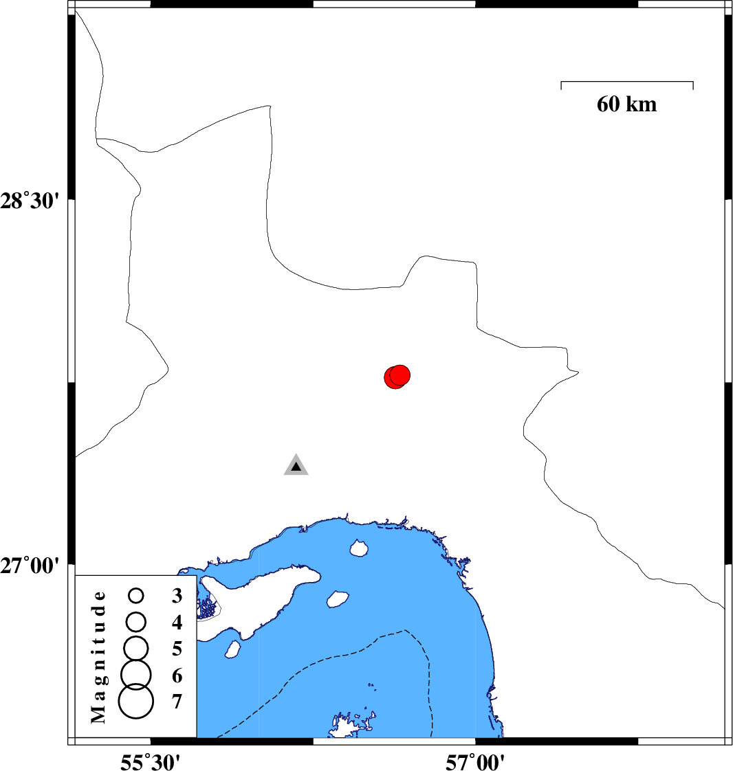 | 2013/01/24 | 09:28:32.3 | 12:58:32.3 | 27.78 | 56.65 | 15 | ML4.2 | Hormozgan Province, 70 km North-West of Dehbarez | ||