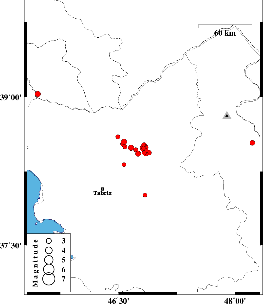 | 2012/12/28 | 00:05:06.6 | 03:35:06.6 | 38.43 | 46.84 | 14 | ML1.9 | Azarbaijan Sharghi Province, 22 km West of Ahar |