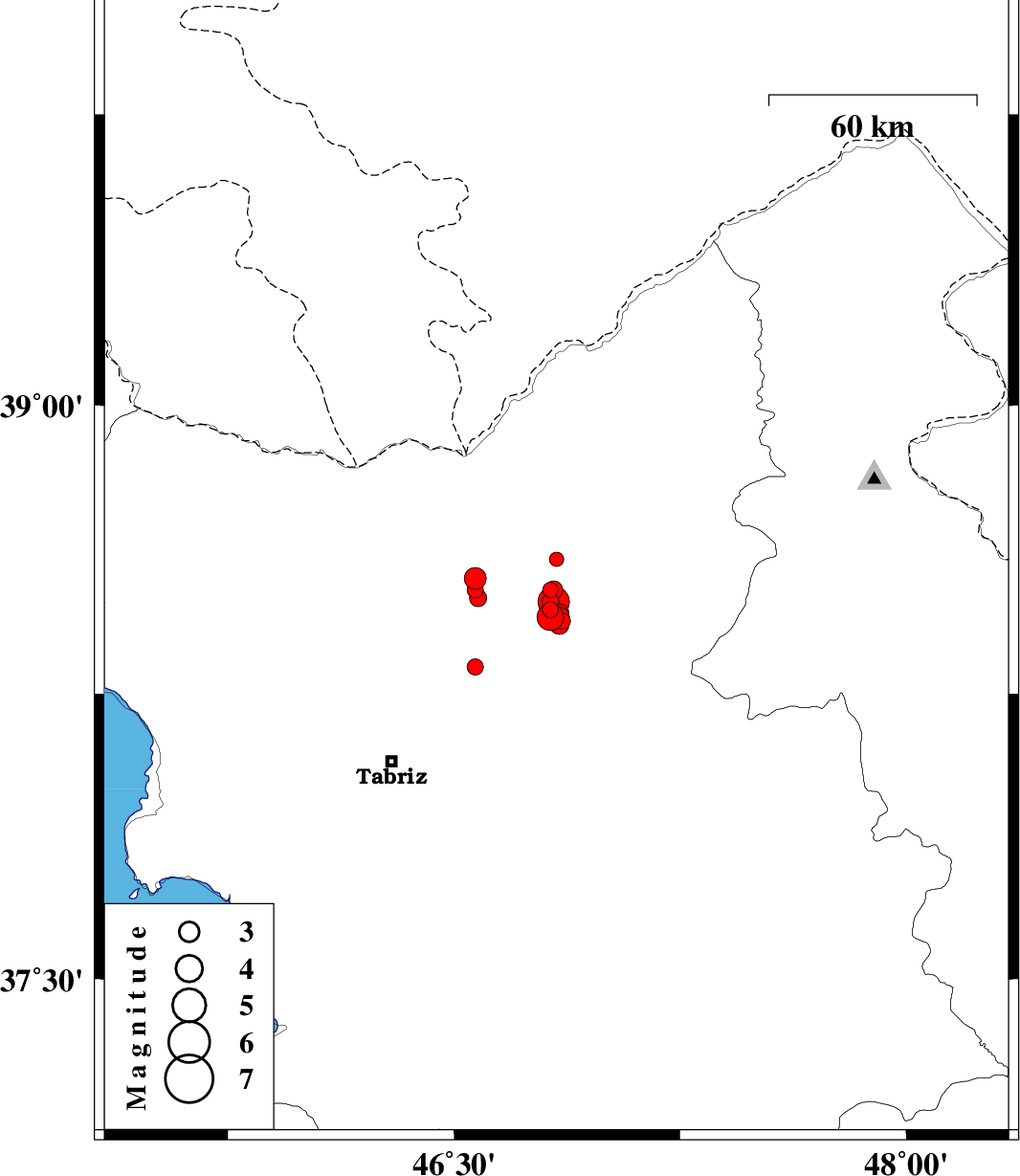 | 2013/01/25 | 03:06:22.4 | 06:36:22.4 | 38.55 | 46.57 | 15 | ML3.2 | Azarbaijan Sharghi Province, 45 km West of Ahar | ||
