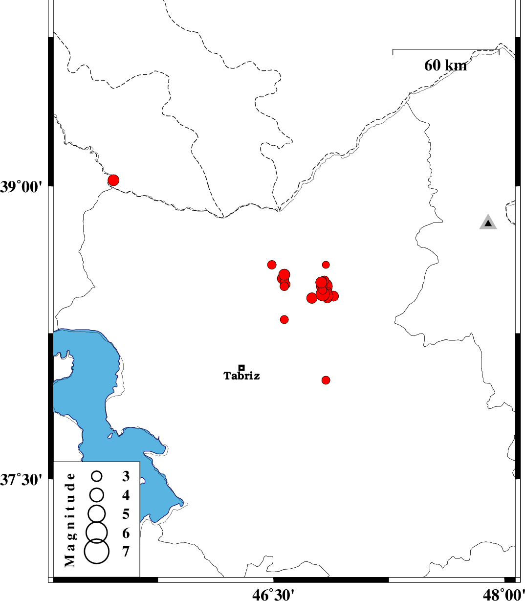 | 2013/01/25 | 03:06:22.4 | 06:36:22.4 | 38.55 | 46.57 | 15 | ML3.2 | Azarbaijan Sharghi Province, 45 km West of Ahar | ||