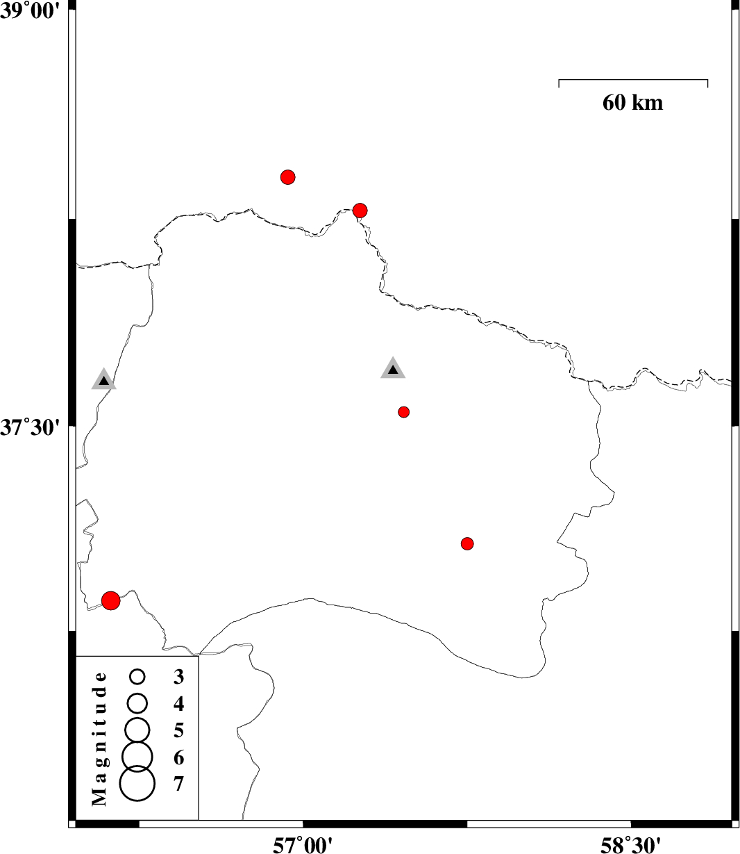 | 2013/02/01 | 20:05:44.3 | 23:35:44.3 | 37.55 | 57.46 | 35 | ML2.3 | Khorasan(north) Province, 14 km East of Bojnurd | ||