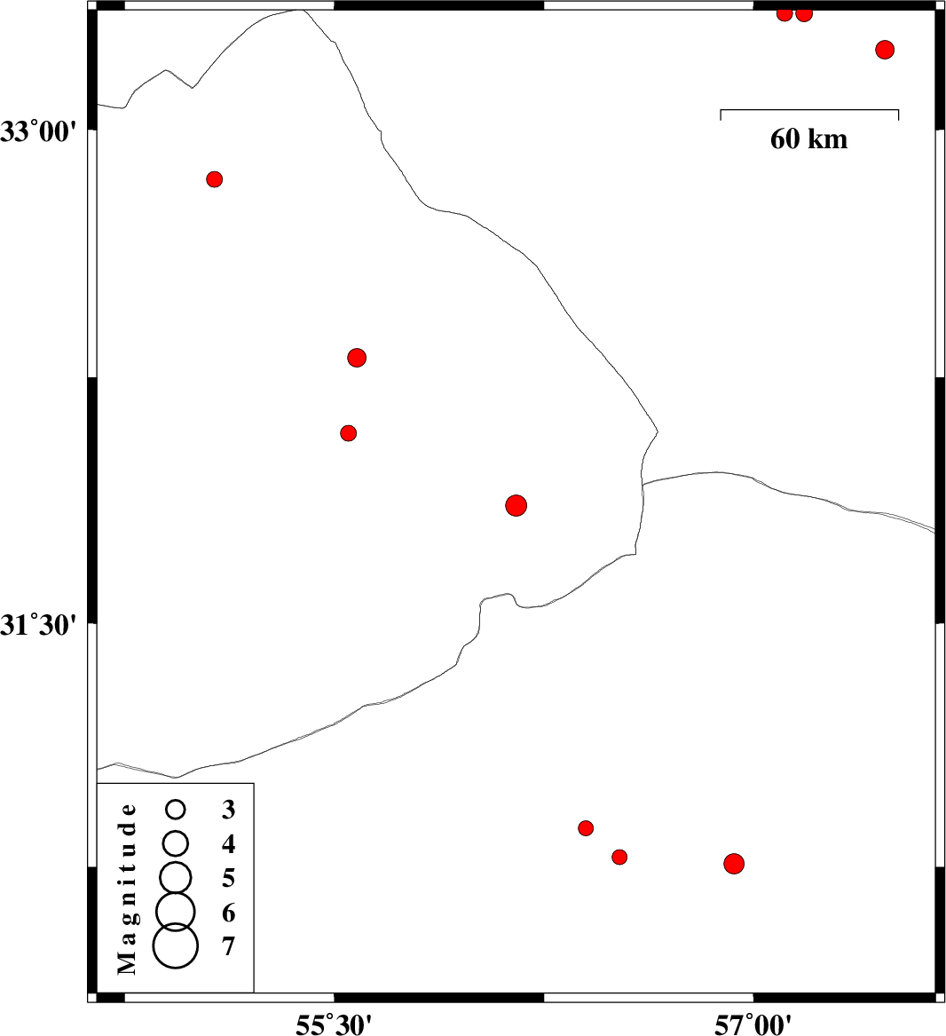 | 2013/01/07 | 18:49:02.8 | 22:19:02.8 | 33.35 | 57.11 | 14 | ML2.5 | Yazd Province, 32 km South-East of Tabas |