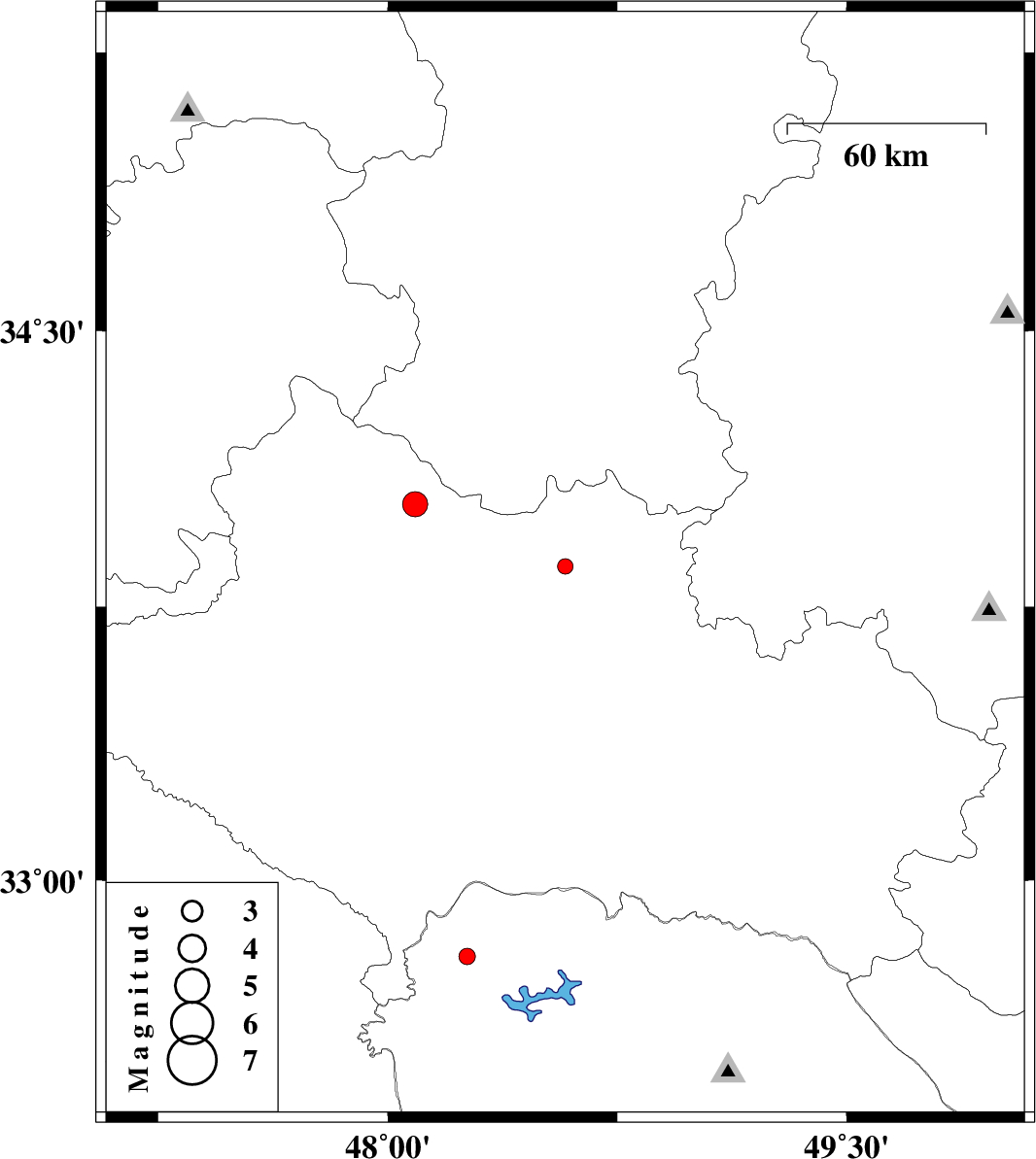 | 2013/02/04 | 05:31:57.5 | 09:01:57.5 | 34.03 | 48.09 | 15 | ML3.6 | Lorestan Province, 12 km East of Nurabad | ||