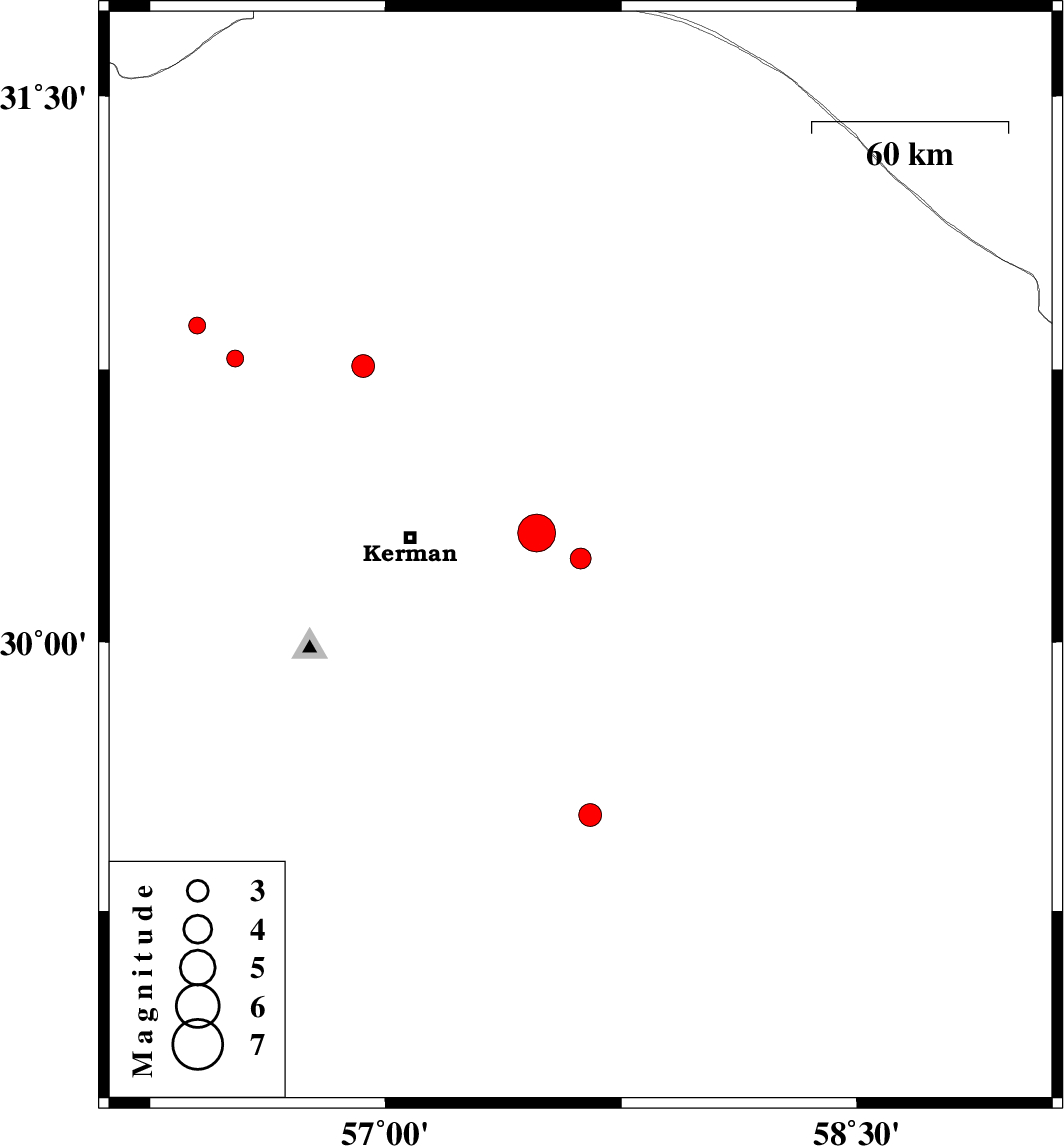 | 2013/01/14 | 05:07:27.0 | 08:37:27.0 | 29.52 | 57.65 | 14 | ML3.2 | Kerman Province, 95 km North of Jiroft |