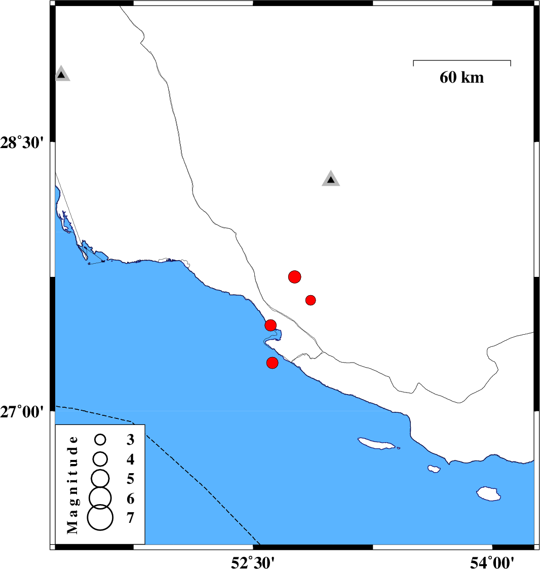 | 2013/02/09 | 19:23:50.7 | 22:53:50.7 | 27.27 | 52.62 | 14 | ML3.2 | Persian Gulf, 41 km South-West of Mehr | ||