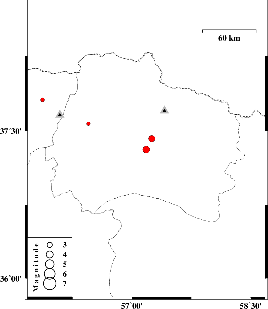 | 2013/02/12 | 12:26:58.1 | 15:56:58.1 | 37.31 | 57.18 | 25 | ML3.9 | Khorasan(north) Province, 23 km South-West of Bojnurd | ||
