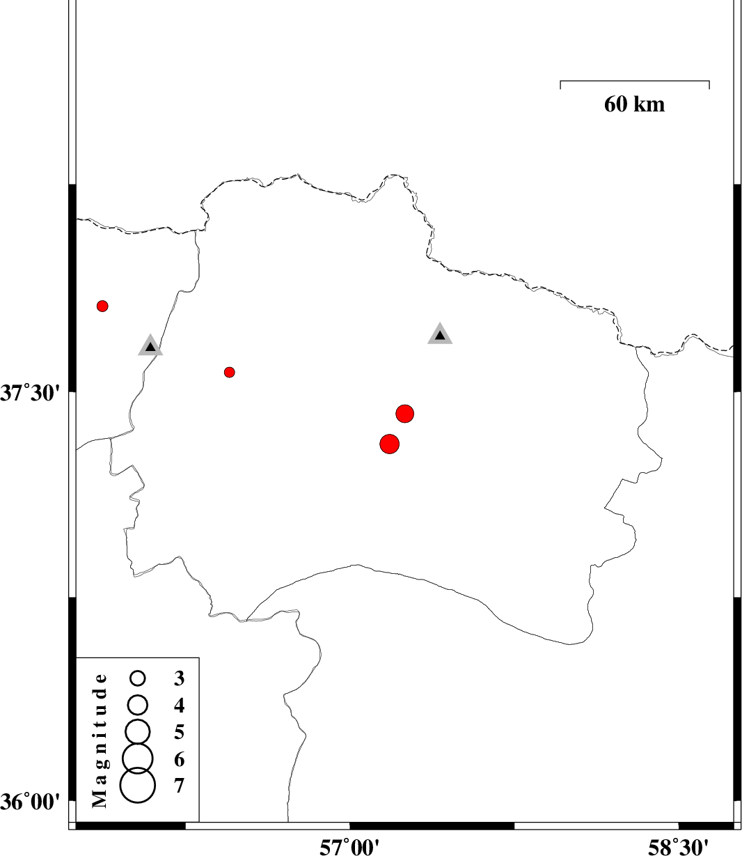 | 2013/02/12 | 12:26:58.1 | 15:56:58.1 | 37.31 | 57.18 | 25 | ML3.9 | Khorasan(north) Province, 23 km South-West of Bojnurd | ||