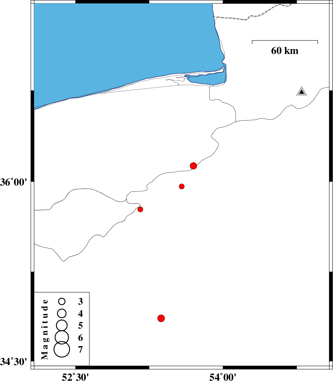 | 2013/02/15 | 23:42:43.8 | 03:12:43.8 | 35.96 | 53.58 | 15 | ML2.4 | Semnan Province, 46 km North-East of Semnan | ||