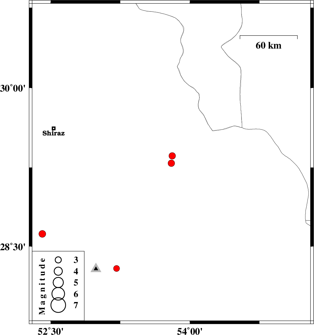 | 2013/02/15 | 12:10:56.2 | 15:40:56.2 | 29.29 | 53.8 | 18 | ML3.2 | Fars Province, 30 km North-West of Estahban | ||
