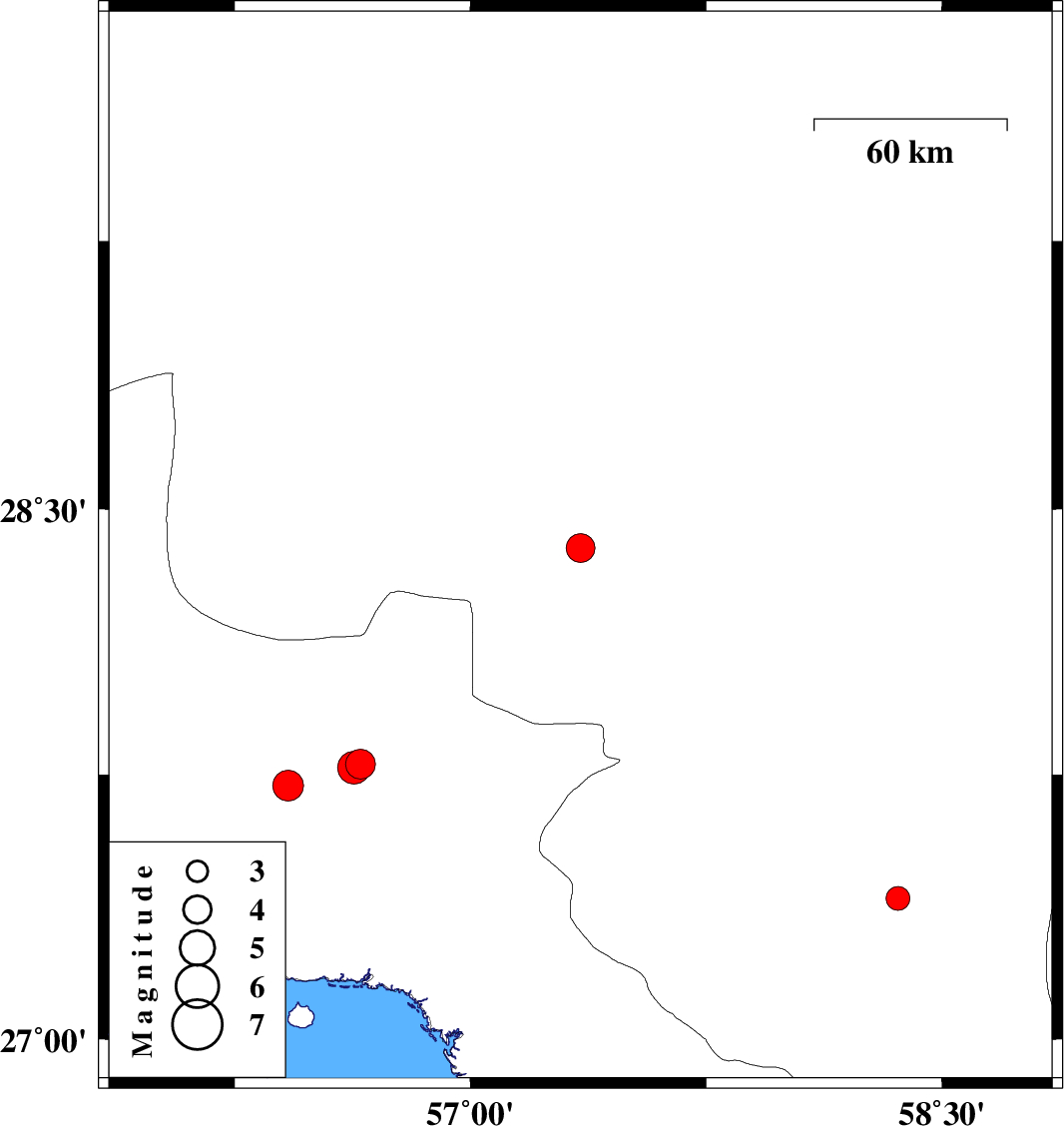 | 2013/02/16 | 13:09:05.1 | 16:39:05.1 | 28.39 | 57.35 | 14 | ML4.1 | Kerman Province, 49 km South-West of Jiroft | ||